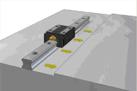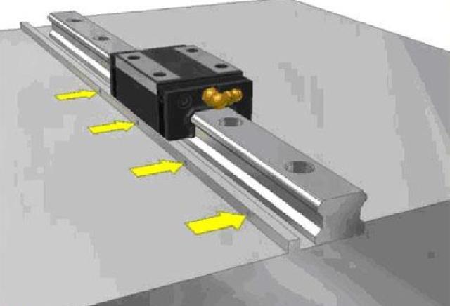 (2)將主軌輕輕安置在床臺上,使用側向固定螺絲或其他固定治具使線軌與側向安裝面輕輕貼合。安裝使用前要確認螺絲孔是否吻合,假設底座加工孔不吻合又強行鎖緊螺栓,會大大影響到組合精度與使用品質。