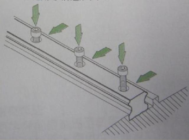 (3)由遠端向近端按順序將滑軌的定位螺絲稍微旋緊,使軌道與垂直安裝面稍微貼合。垂直基準面稍微旋緊后,加強側向基準面的鎖緊力,使主軌可以確實貼合側向基準面。