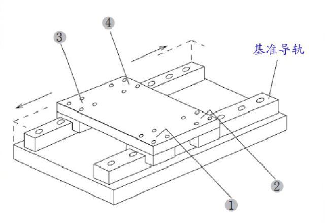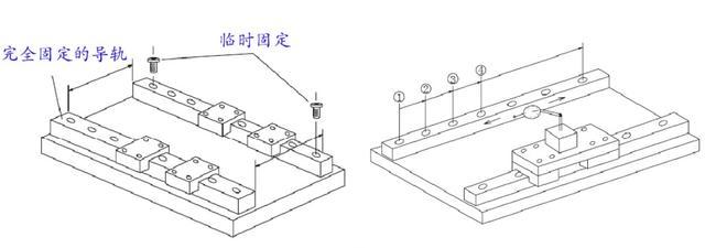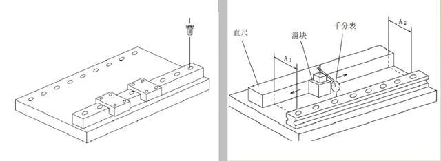 (3)剛才被完全固定的導軌此時可以當做基準軌使用了,在從動導軌的兩端各暫時擰上一個螺釘。然后在基準軌的兩個滑塊上放置千分表,移動千分表邊讀數(shù)邊把調整軌的螺栓從一端向另一端依次鎖緊。