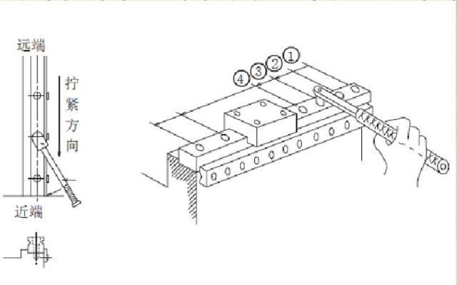 (2)由遠端向近端依次鎖緊螺釘,螺釘鎖緊扭矩參照上例中的扭矩表數(shù)值。所有的螺栓擰緊后用千分表從導軌一段滑到另一端確保平行度。當無側向定位裝配面時,如果螺釘從導軌中部開始安裝,由于安裝螺栓和安裝孔之間存在的摩擦,很容易造成導軌的微小S變形,建議由遠端向近端依次鎖緊螺釘。